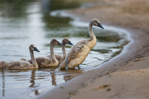 Family of swans on the shore