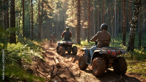 family on atvs following a forest trail together