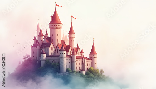 Fantasy style castle with colorful towers surrounded by mist in a dreamy atmosphere