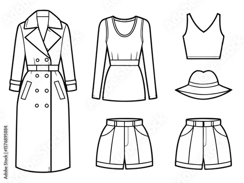 Fashion outfit illustrations showcasing a trench coat long sleeve top shorts hat and crop top designs. Clothing icons set.