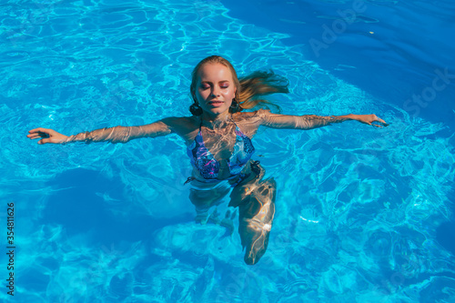 Fashion portrait of beautiful sexy young woman in swimming pool