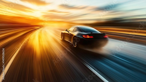 Fast black car speeding sunset, blurred motion.