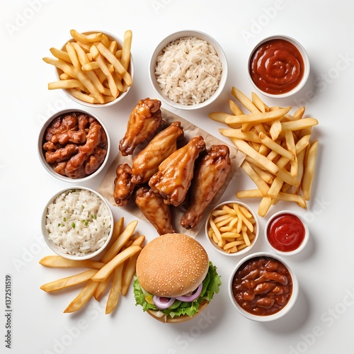 Fast Food Feast Burger, Fries, Chicken Wings, and Dips