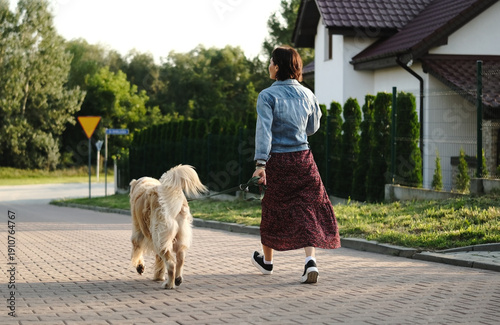 Female Dog Owner Walks Adorable Golden Retriever At Sunset On A Street During Daily Routine