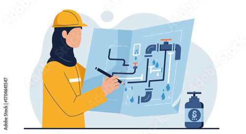 Female Engineer in Yellow Outfit Examines Blue Plumbing Blueprint with Pen on White Background Flat Illustration