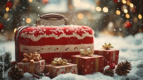 Festive holiday travel suitcase with gifts winter wonderland photography cozy atmosphere close-up celebratory spirit