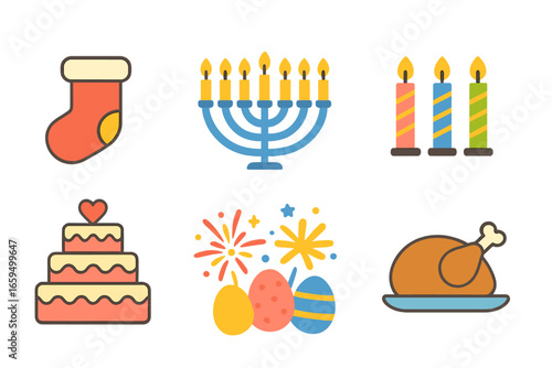 Festive Traditions Icons. Flat vector mini-illustrations gift traditions in colors children's illustrations: Christmas stocking,