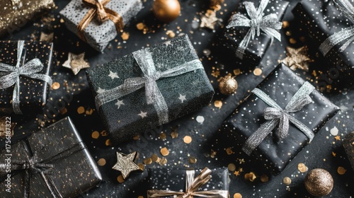 Festive Wrapped Gifts with Glittering Ribbons and Sparkling Decorations on Black Surface for Holiday Celebrations