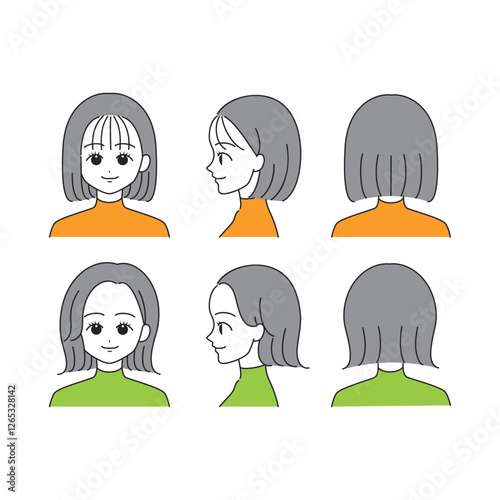 ボブヘアの女性の顔アイコンセット(正面・横顔・後ろ姿)【ベクターイラスト】