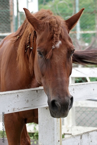たてがみを三つ編みにした馬の顔のアップ