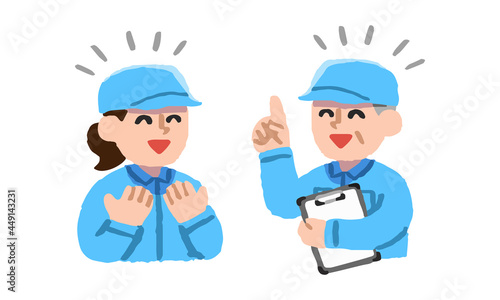 男性上司から仕事について説明を受ける作業着姿の女性(手描きカラー)
