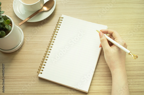 빈 공책에 펜을 들고 있는 여성의 손
