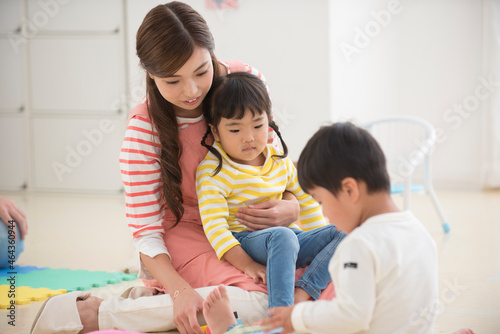 保育園で遊ぶ園児と保育士