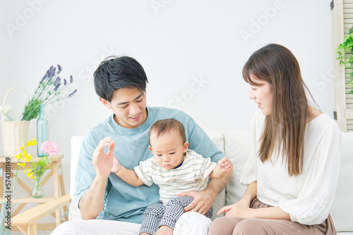家で赤ちゃんと遊ぶ両親