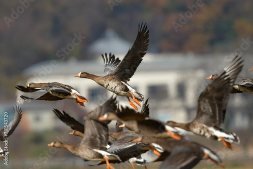 大群で冬に見られる渡り鳥、オレンジ色の嘴と脚が目立つ水鳥の仲間マガン