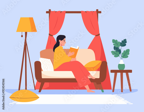 Flat vector illustration of woman reading book under small lamp light