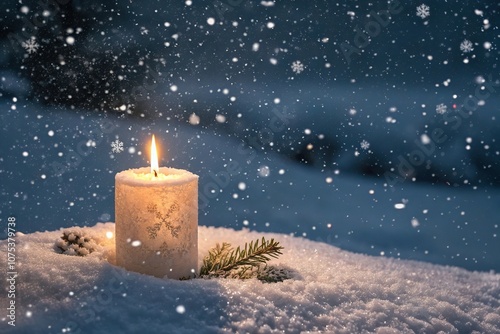 Flickering candle with snowflakes surrounding it, candle flame, winter wonderland, mystical atmosphere
