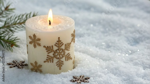 Flickering candle with snowflakes surrounding it, snowy landscape, wintry scene, festive lighting