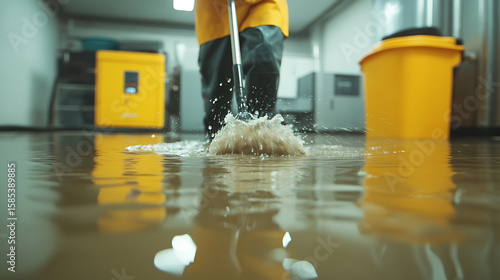 Flood Cleanup: A worker wearing protective gear mops up a flooded room, with water splashing around the mop. Yellow equipment and a bucket are in the background.