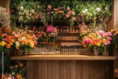 Floral Decorated Bar Backdrop With Bottles and Glasses