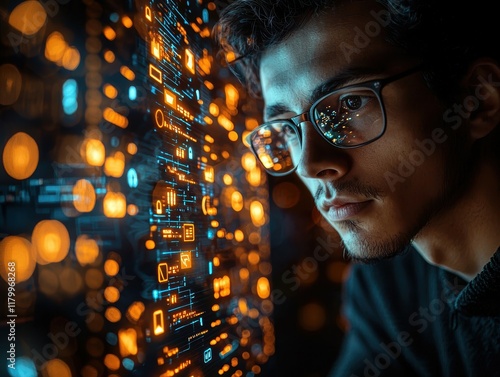 Focused South Asian man with glasses analyzing digital data against a futuristic backdrop.