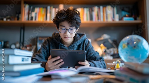 Focused Student Studying with Tablet and Globe: Education, Learning, and Global Perspective