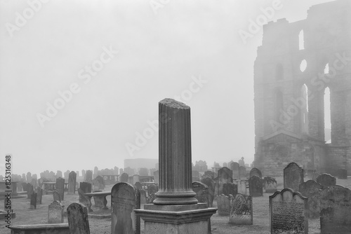 Foggy cemetery with old gravestones and ruins in Tynemouth Priory and Castle