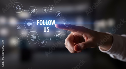 Follow Us Digital Interface: A modern graphic showcases a hand interacting with a Follow Us interface, symbolizing connection and interaction in the digital realm.
