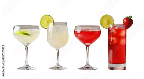 Four colorful cocktails isolated on transparent background are displayed
