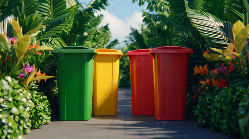 Four colorful recycling bins in green, yellow, and red are placed outdoors, surrounded by lush tropical plants under a bright blue sky.