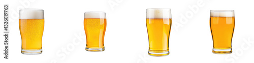 Four glasses of beer in varying sizes, displaying golden liquid with frothy tops.