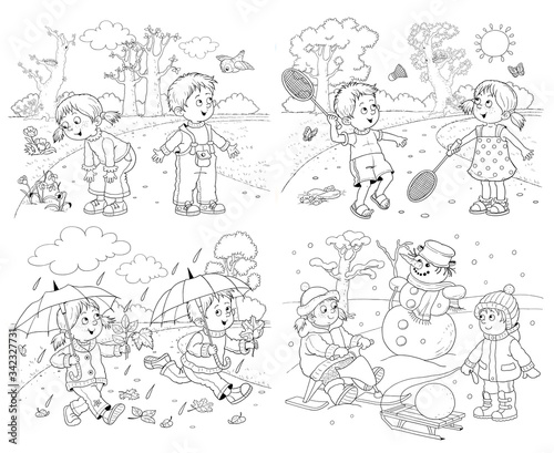 Four seasons. Spring, summer, autumn, winter. Set of 8 pictures. Cute boy and girl are playing outdoors. In the forest. Coloring book. Poster. Illustration for children. Cartoon characters