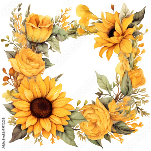 Frame of watercolor Sunflower. Floristic design elements for floristics. Hand drawn illustration. Greeting card. Floral print. Plant painted background. Watercolour painting. Template.
