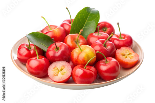 Fresh acerola cherries on a plate - A plate filled with ripe acerola cherries, also called Barbados cherries, with vibrant red and orange colors, green leaves, and sliced pieces.