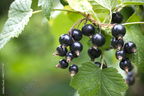 Fresh black currants on a branch with green leaves in a garden