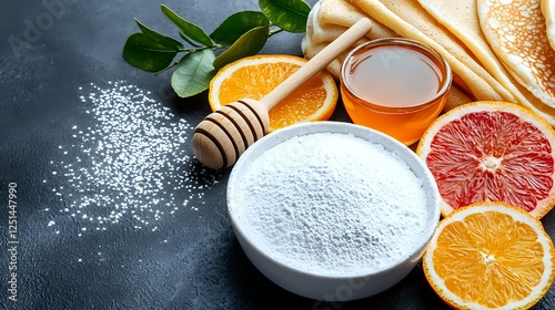 Fresh citrus fruits with honey, flour in white bowl and wooden dipper on dark background, top view. Natural baking ingredients for homemade pastry.