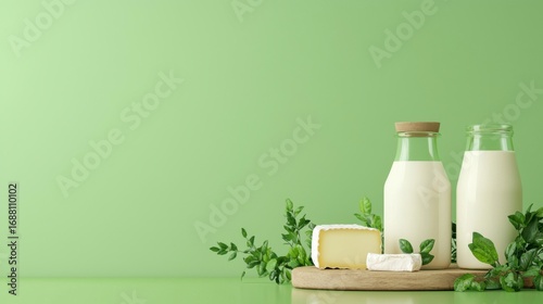 Fresh dairy products including milk bottles and cheese on a green background, complemented by leafy greens for a vibrant, healthy display.