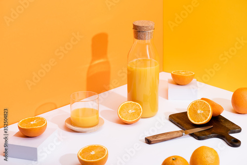 fresh orange juice in glass and bottle near ripe oranges, wooden cutting board with knife on white surface on orange background