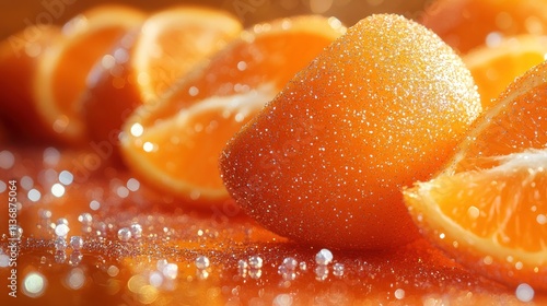 Fresh orange slices twinkle with droplets, reflecting golden sunlight in a delightful arrangement