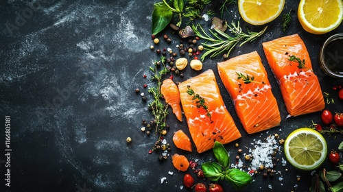 Fresh salmon fillets with herbs and citrus on dark background for culinary presentations and gourmet cooking concepts
