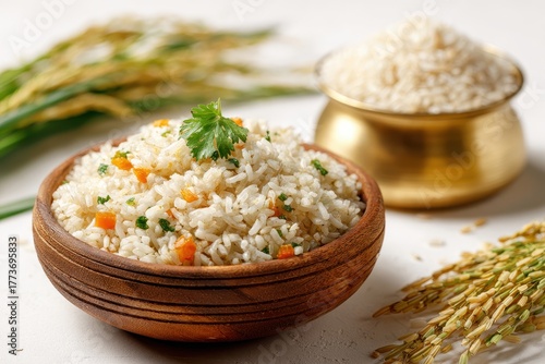 Freshly Cooked Rice in Wooden Bowl with Herbs.