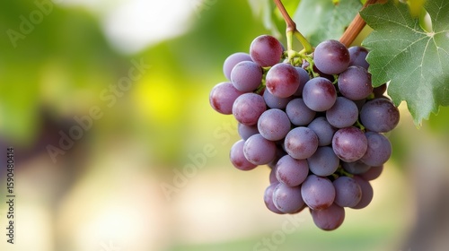 Freshly picked purple grapes hanging from the vine in a vibrant vineyard