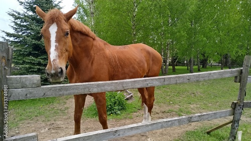 Friendly, curious brown horse with a white stripe in the face on a pasture among birches and firs looking at the camera through the wooden fence