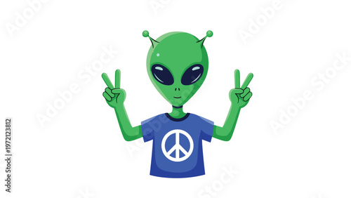 Friendly green alien wearing a blue peace symbol t-shirt shows double peace signs in a bright and playful illustration.