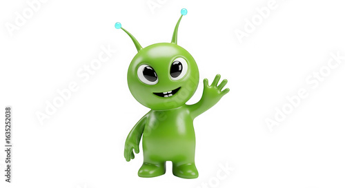 Friendly green cartoon alien character waving hello with big eyes and antennae isolated on transparent background