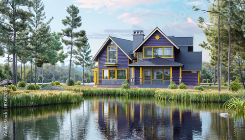 Front view of a newly constructed craftsman style purple house with yellow accents, by a serene lake.