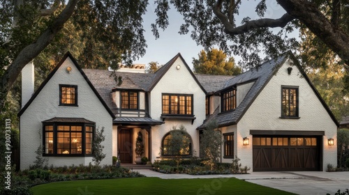 Front view of white colonial style suburban house with large garage