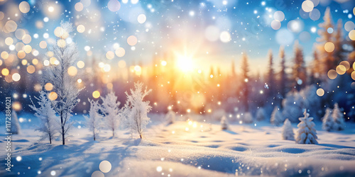 Frosty winter wonderland scene with snowflakes gently falling, blurred bokeh lights twinkling in the background, and a serene forest landscape covered in snow and ice.