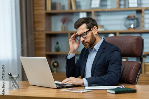 Frustrated administrator experiencing headache while sitting by desk with portable computer in modern interior. Exhausted man feeling pain in temple and getting distracted from working process.