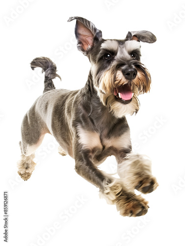Full body shot of Miniature Schnauzer dog, running happily, smiling.